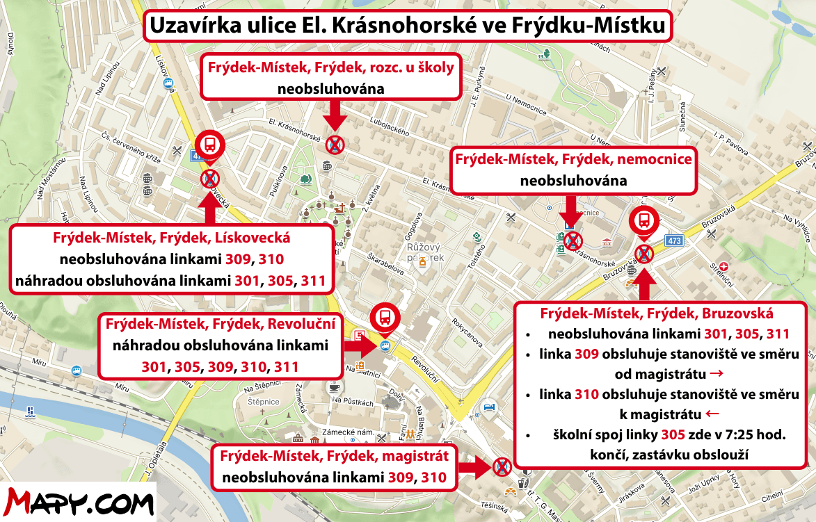 - linky 301, 305 a 311 náhradou obslouží zastávku Frýdek-Místek, Frýdek, Revoluční
